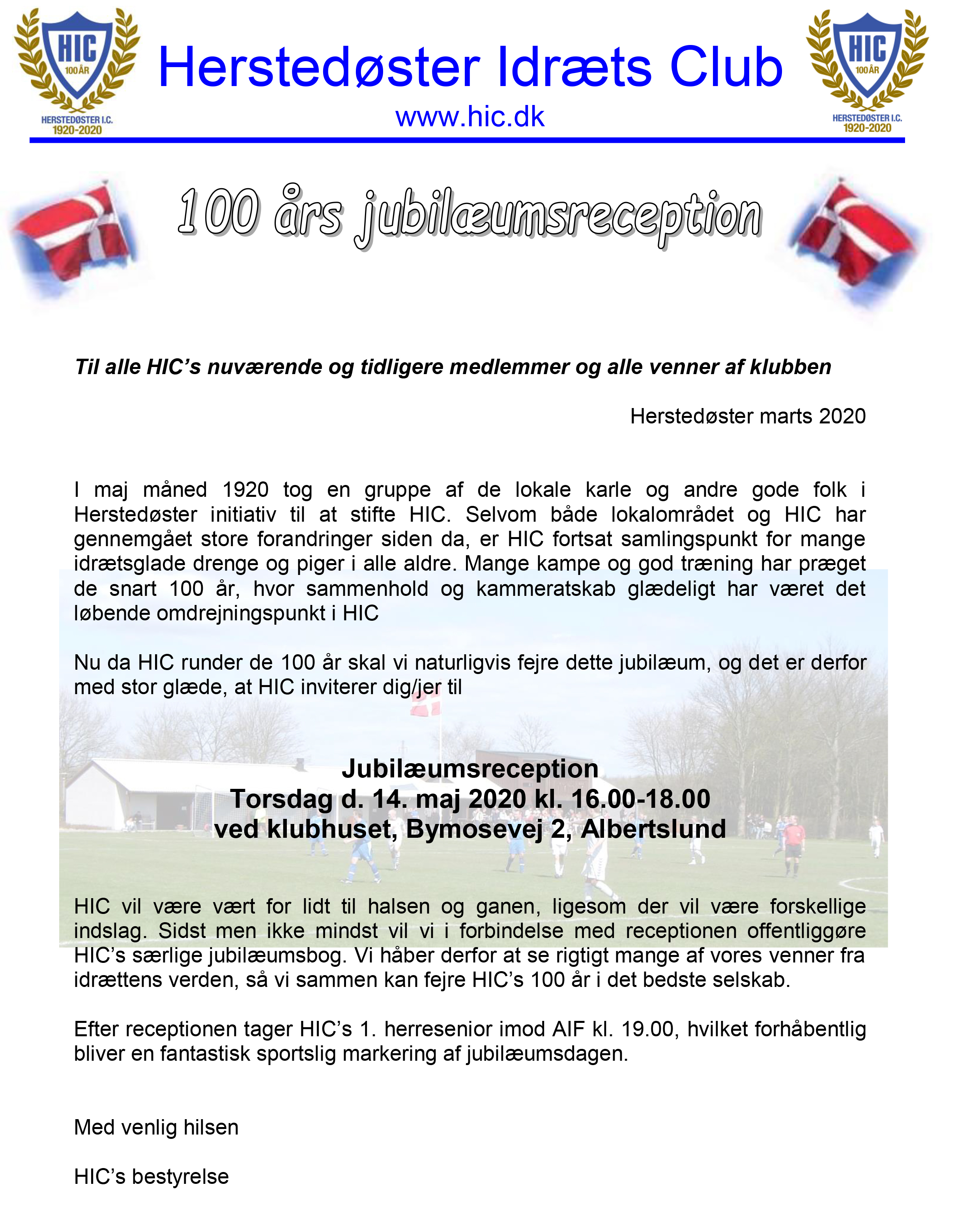 Torsdag d. 14. maj 2020 runder HIC de 100 år, hvorfor vi gerne vil invitere jer alle til jubilæumsreception. Vi håber selvfølgelig at kunne fejre jubilæet på selve dagen, men hvis coronavirussen forsat skulle begrænse arrangementer, vender vi tilbage med info om udskydelse til senere dato.