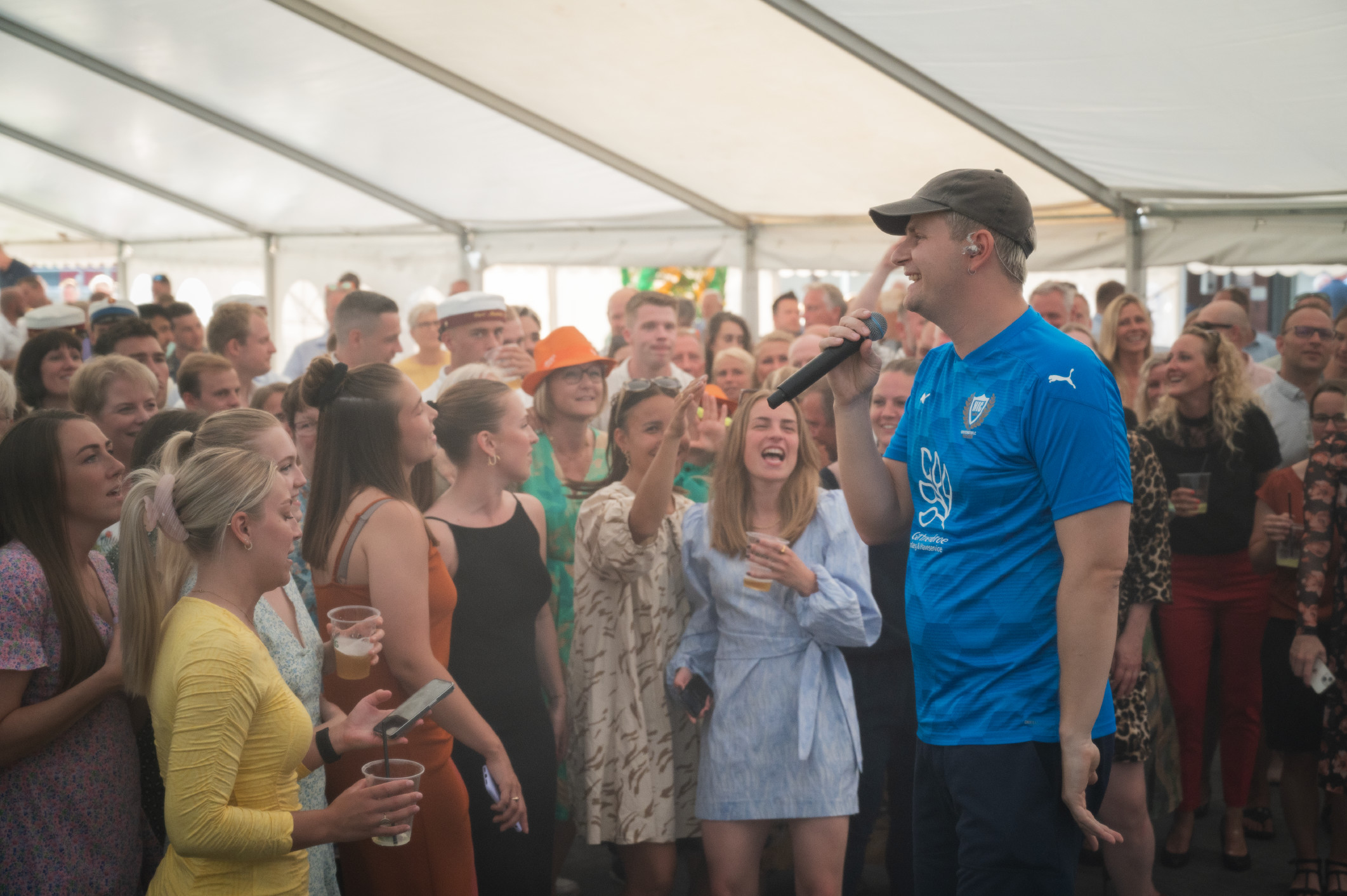 Ellers stod aftenen på fest og dans, hvilket i den grad blev skudt igang af bestyrelsens overraskelse, da Mads Bo Iversen fra Phlake indtog scenen, og med et brag af en minikoncert løftede stemningen helt i top. Mads Bo er en rigtig Herstedøsterdreng og har tidligere spillet i HIC, og var naturligvis iklædt en smuk HIC-trøje.