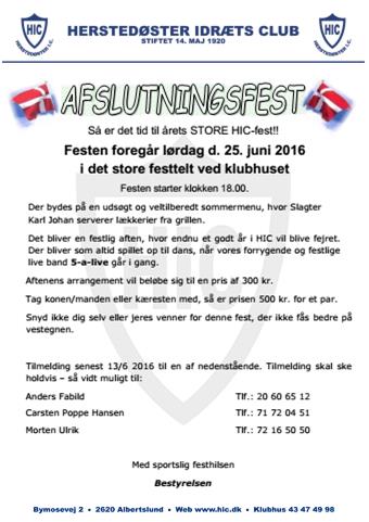 Traditionen tro afslutter HIC sæsonen med et brag af en fest. Årets store afslutningsfest afholdes lørdag d. 25. juni.