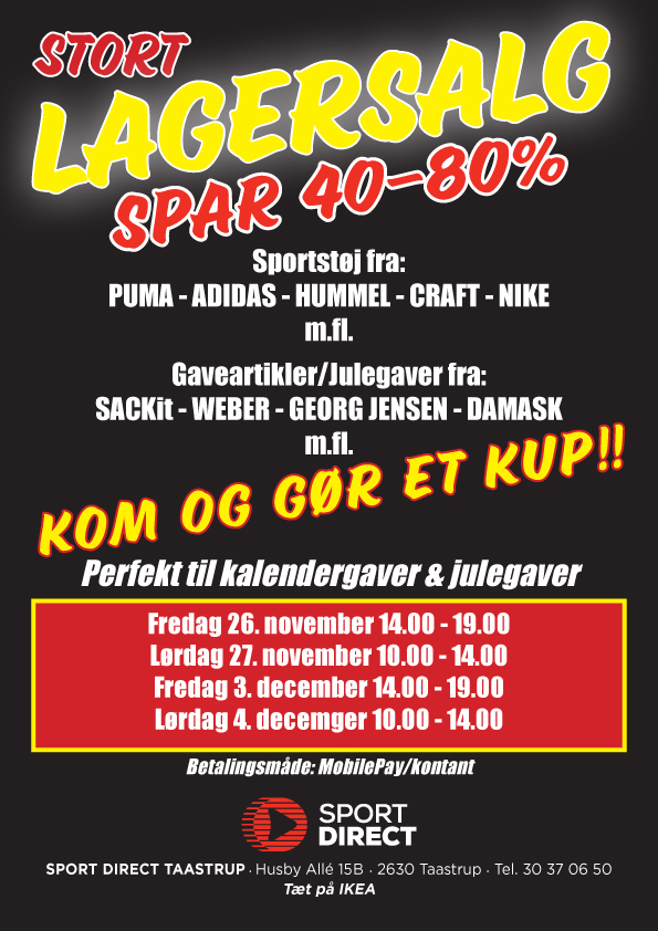 Sport Direct åbner dørerne for lagersalg fredag-lørdag den 27 og 28 november samt fredag-lørdag den 3 og 4 december.